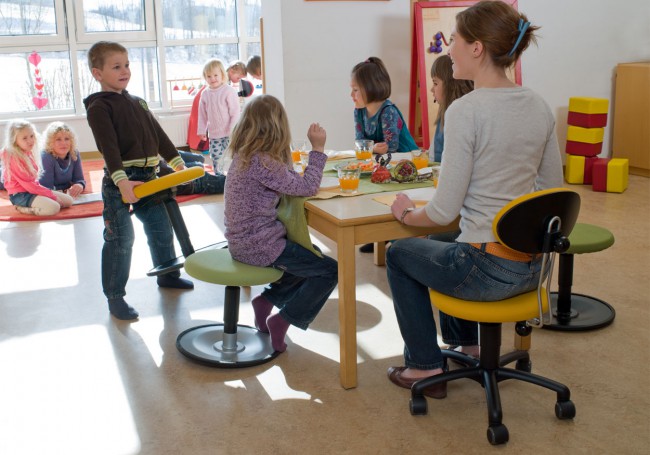 Erzieherin sitzt auf Leitnerwist und Kind auf Leitnerwipp